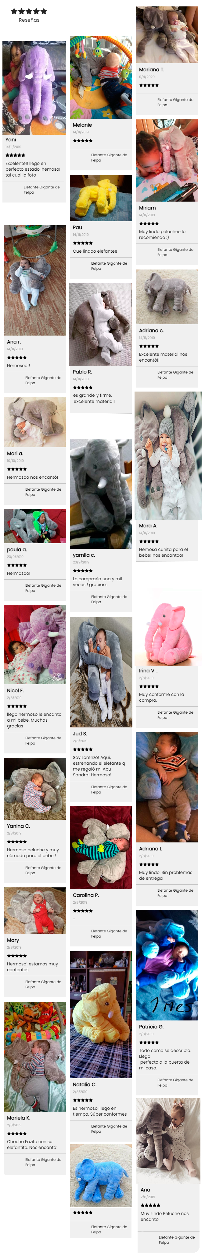 El peluche está diseñado con felpa, una tela de fibra muy suave hipoalergenica. Su uso es ideal para bebés. El tamaño del elefante es de 70cm de largo de cabeza a patas y 50cm de ancho. Sentado de cabeza a lomo 65cm.